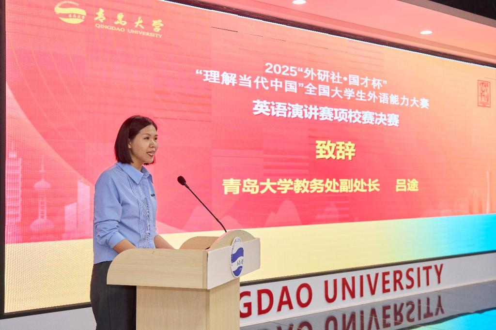 吕途在致辞中指出,语言是沟通的桥梁,思想是时代的先声。本次大赛以“理解当代中国”为主题,紧扣时代脉搏,不仅为同学们提供了展示英语应用能力与思辨能力的舞台,更搭建了一个向世界讲述中国故事、传播中国声音的重要平台。她鼓励参赛选手珍惜机会,以自信从容的姿态,充分展现青大学子的智慧与风采。