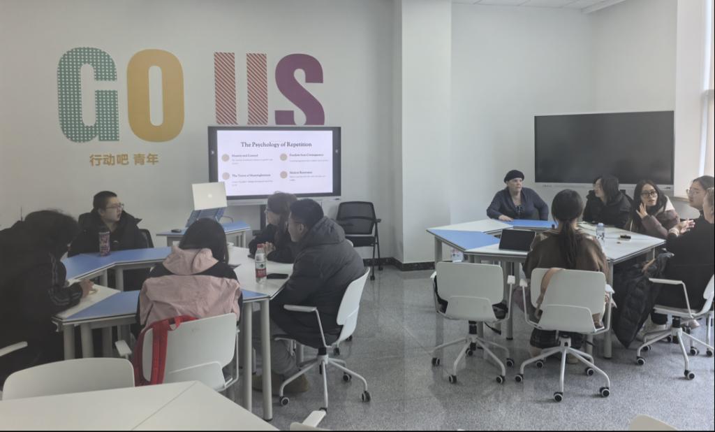 活动“Time Loops: Cycle, Reflection & Growth”在浮山校区西院慧创空间201室温馨启幕。外籍教师Diane Thayer、Scott Stephenson、Debra Stephenson、Catherine Porter与全校英语爱好者齐聚一堂,一场关于时间循环的深度探索与英语交流就此展开。